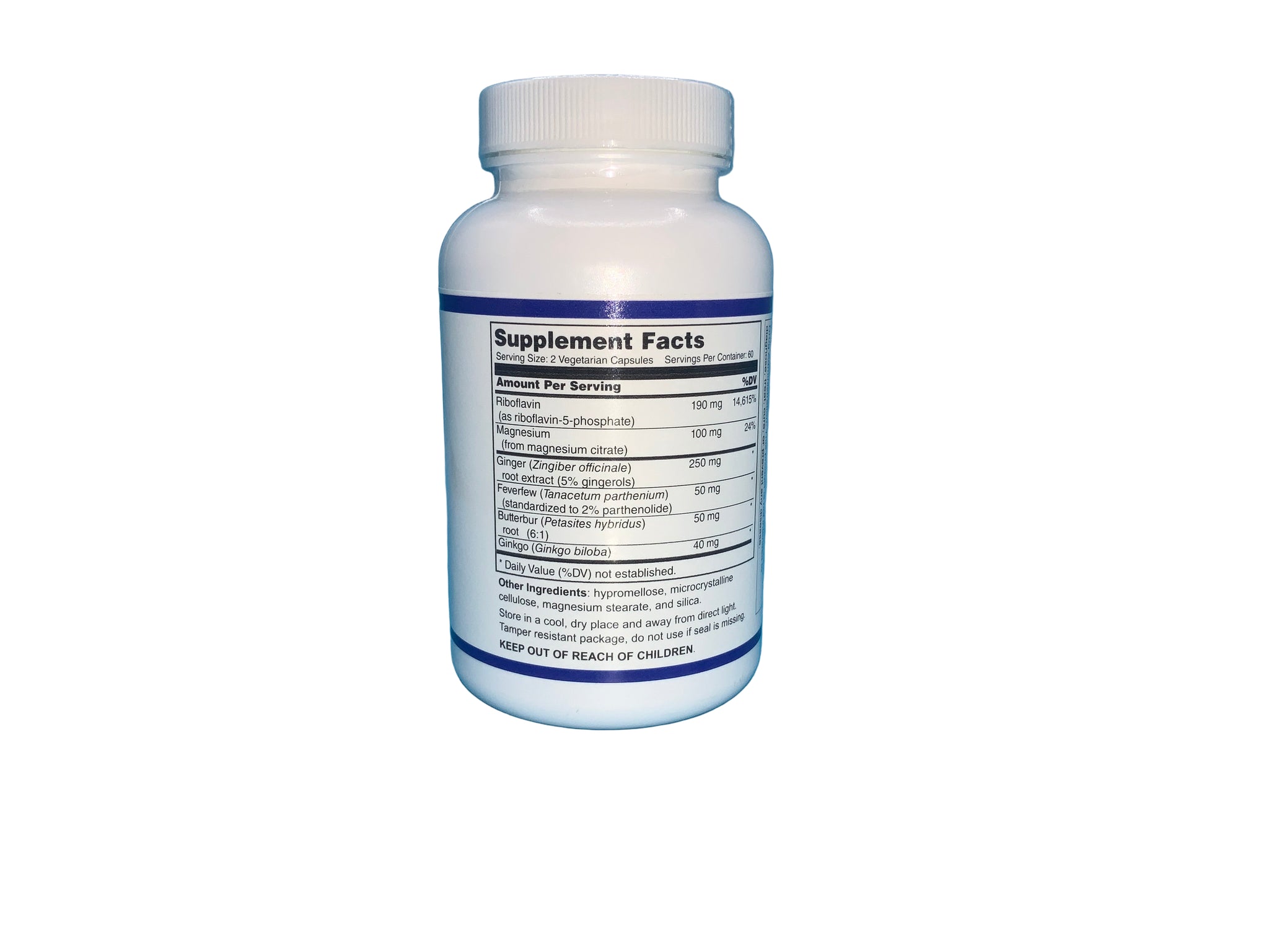 Ingredients: Riboflavin, Magnesium, Ginger, Feverfew, Butterbur, Ginko.